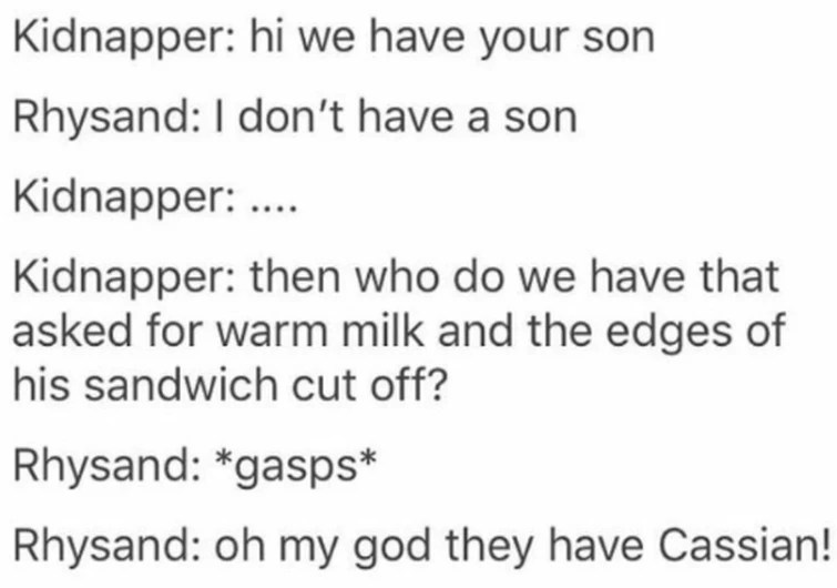 If you discover this site serviceableness, please support us by sharing this posts to your preference social media accounts like Facebook, Instagram and so on or you can also Download this blog page with the title Cassian Acotar Memes by using Ctrl + D for devices a laptop with a Windows operating system or Command + D for laptops with an Apple operating system. If you use a smartphone, you can also use the drawer menu of the browser you are using. Whether it’s a Windows, Mac, iOS or Android operating system, you will still be able to bookmark this blog.